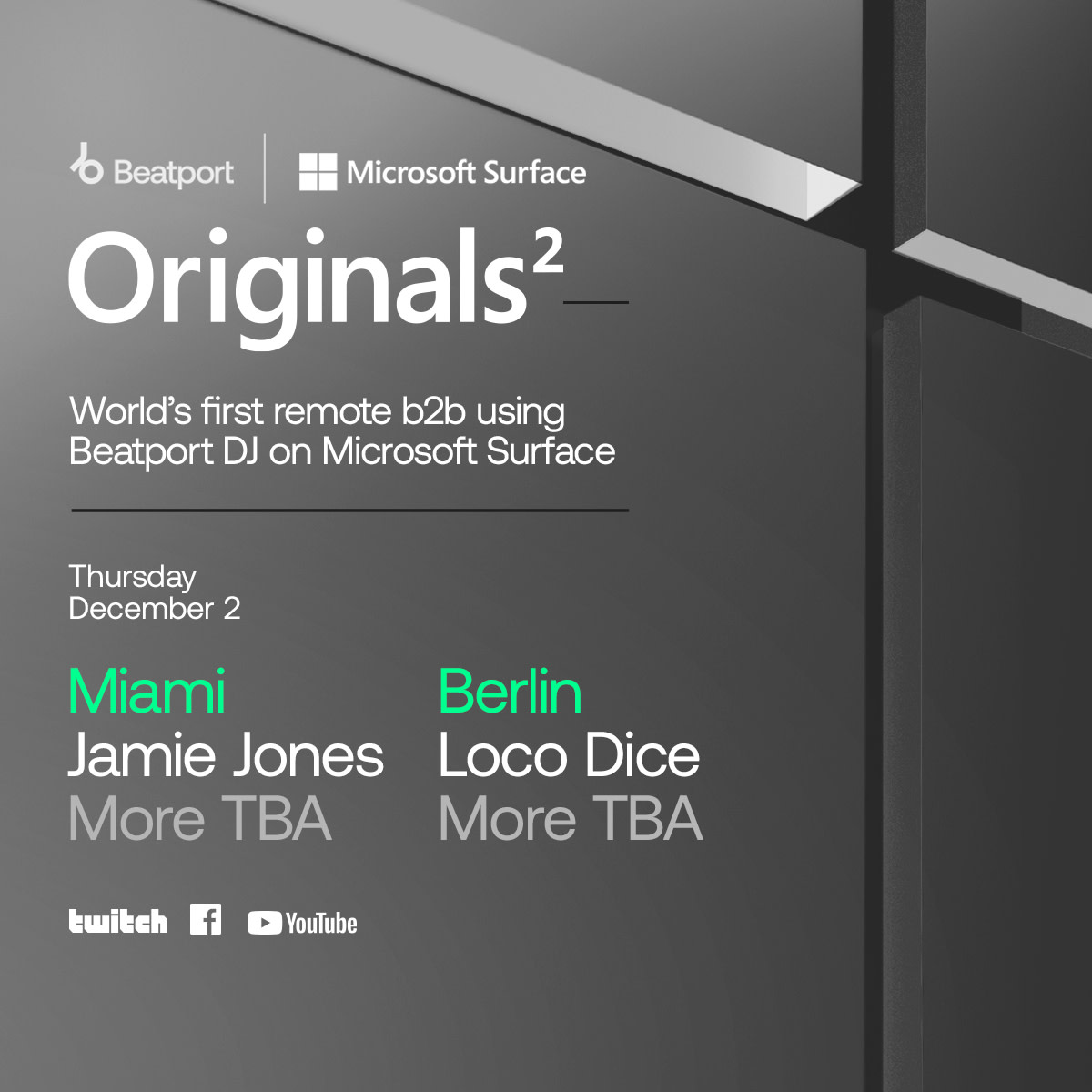 Le premier avant-goût de ce que Originals2 a à offrir aura lieu le 2 décembre au sommet Art Basel de Miami Beach avec le lancement de « Party Mode », une fonctionnalité de l’application Beatport DJ et optimisée pour les interfaces à écran tactile Surface.