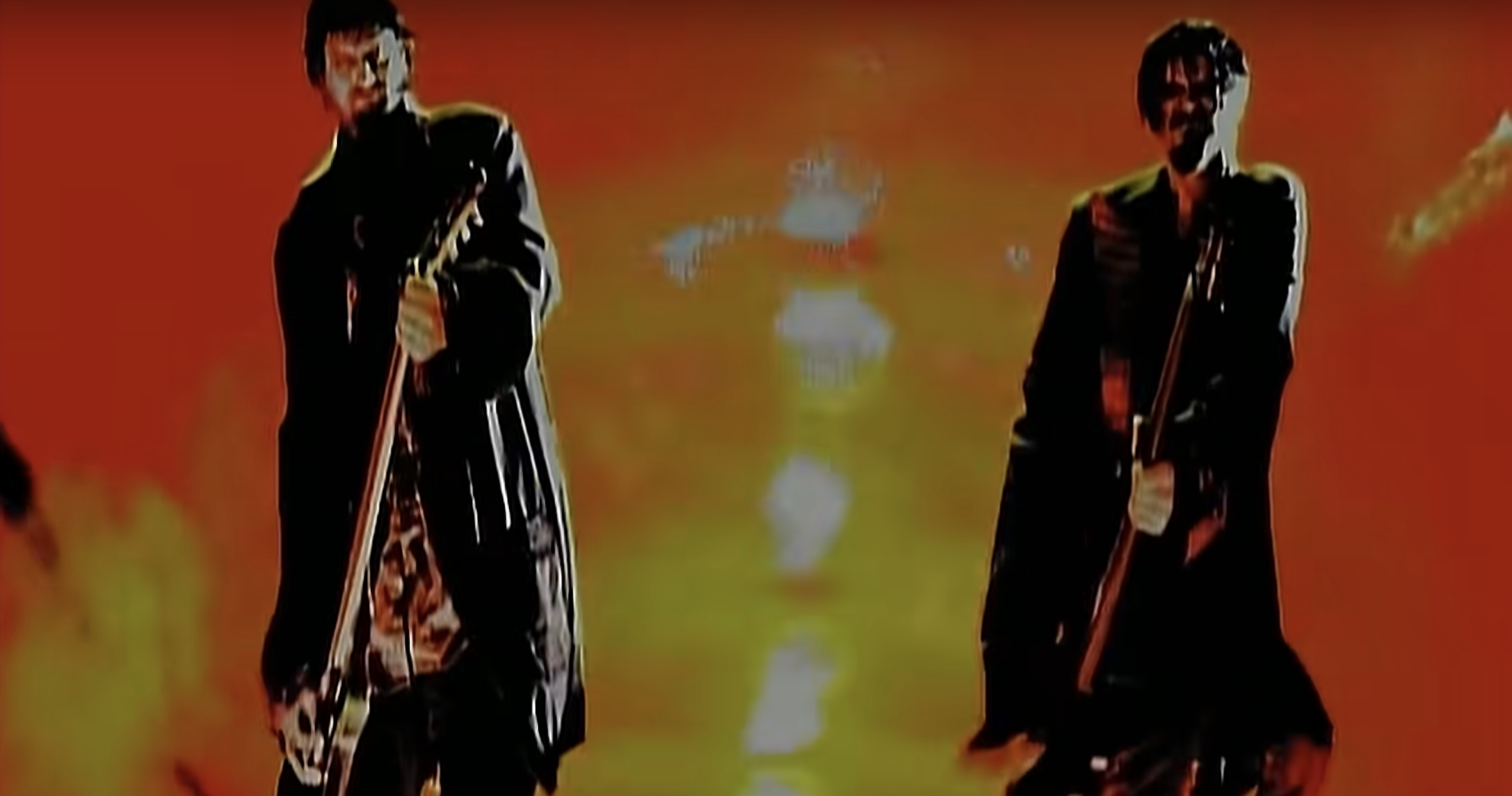 J’appelle le clair The Blood Guitar et le vert The Re-animator… J’ai eu l’idée quand quelqu’un m’a dit ‘Il n’y a rien de nouveau à faire à une guitare / tout a déjà été fait à une guitare.’ Alors j’ai eu l’idée d’une guitare claire dans laquelle on peut mettre des trucs différents… à l’origine j’avais un serpent albinos « mort » que j’allais mettre dedans et j’ai eu l’idée d’y ajouter de la viande pourrie qui se remplirait d’asticots et Je crois Rob a dit quelque chose comme « ça va empester la bande-annonce » ou quelque chose comme ça… Donc ça a fini par être du sang et ça a mieux fonctionné car cela implique le public et le couvre de sang.