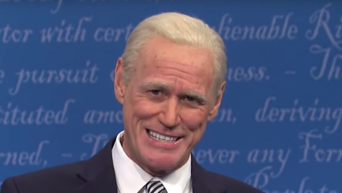 À ce stade, la représentation de Biden par Carrey s'est souvent aventurée dans le surréel. Dans un riff torturé à la volée qui a atterri sur Mike Pence lors du débat sur la vice-présidence, Carrey’s Biden est passé par un téléporteur qui l'a transformé en hybride homme-mouche de Jeff Goldblum du film de David Cronenberg La mouche. Une autre ouverture froide a vu Carrey's Biden passer à M. Rogers (inspiré par un tweet très moqueur suggérant que la ressemblance de Biden avec M. Rogers était une très mauvaise chose), suivi d'une incursion dans le territoire de Bob Ross.
