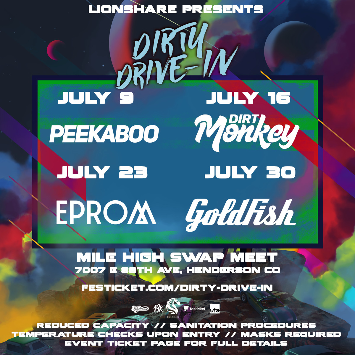 Bouclez votre ceinture, fans de Denver EDM, car la première série de rave drive-in de la ville est arrivée. Lionshare présente etFeyline se sont associés pour "Dirty Drive In", une nouvelle série de rave drive-in qui sortira pendant les week-ends consécutifs les 9 juillet, 16 juillet, 23 juillet et 30 juillet au Mile High Swap Meet Lot.