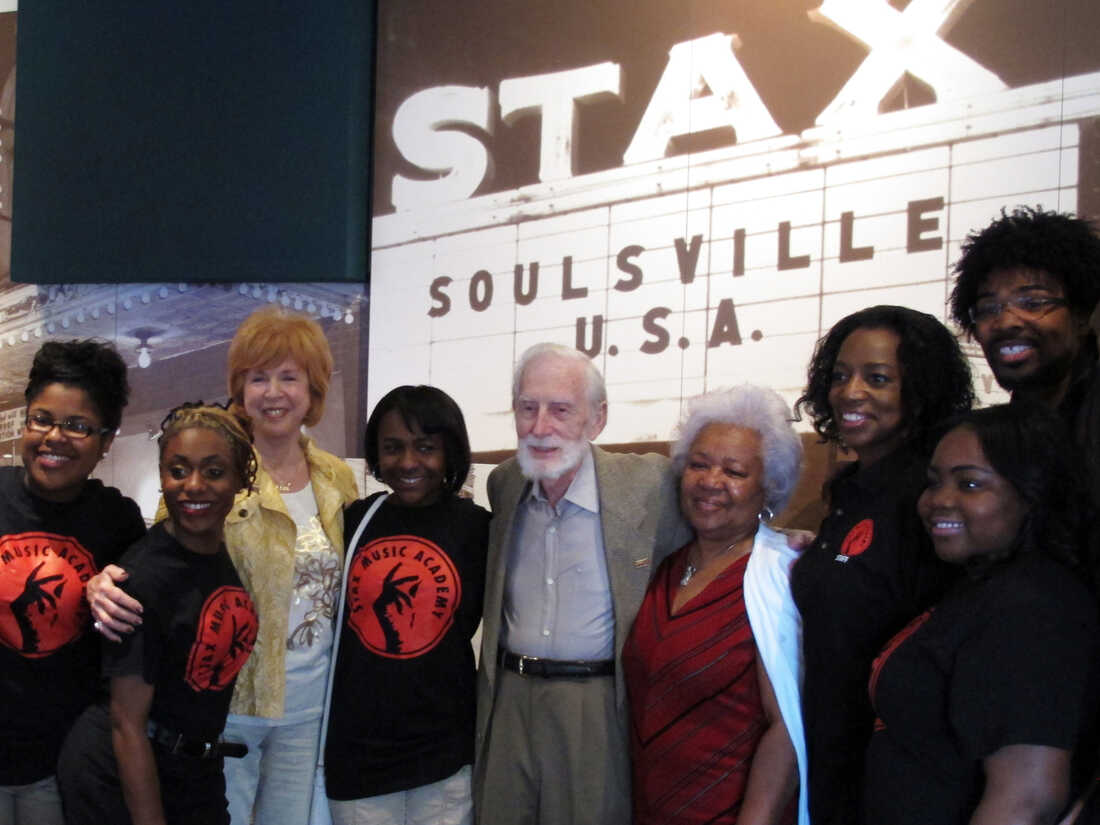 Le co-fondateur de Stax Records, Jim Stewart (au centre), pose pour une photo avec des amis et des étudiants de la Stax Music Academy le 29 avril 2013 à Memphis, dans le Tennessee. Stewart est décédé lundi à l’âge de 92 ans.