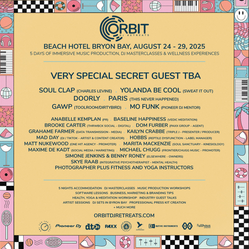 La retraite de Byron Bay apporte sa propre gamme impressionnante, y compris Soul Clap, Yolanda Be Cool et Doory avec un invité surprise. Comme la retraite d'Ibiza en septembre, les participants apprendront une formation technique en équipement Ableton, Logic Pro et Pioneer DJ, ainsi que des stratégies commerciales pour la croissance de l'industrie musicale.