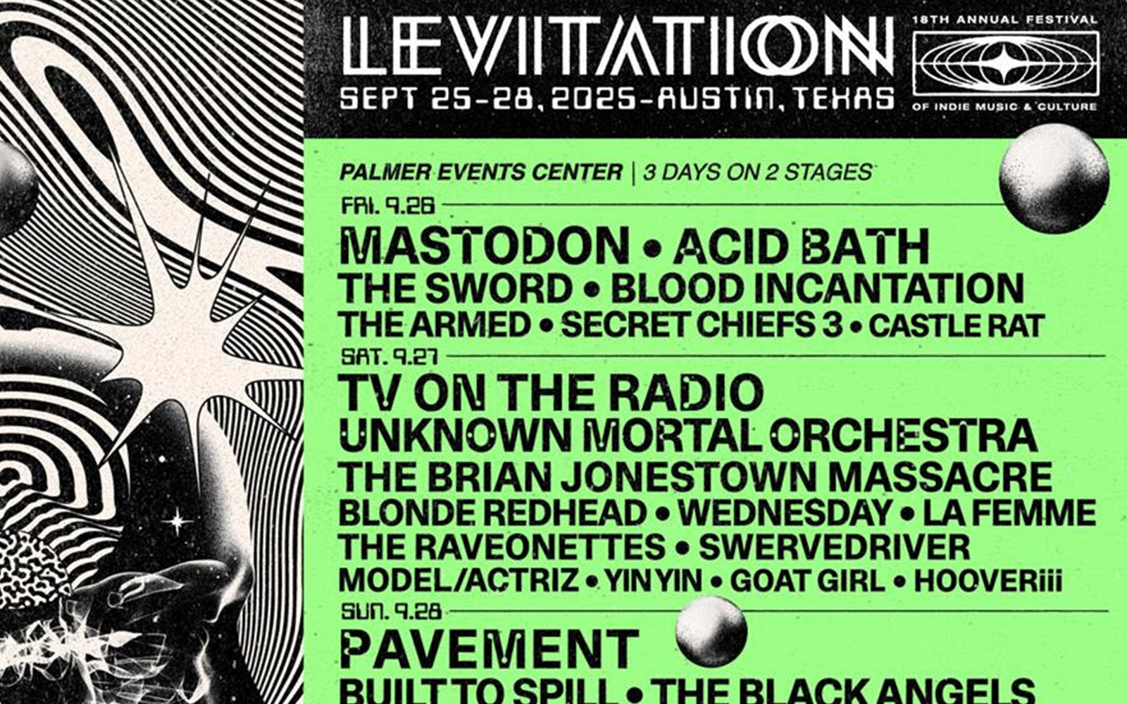 Lévitation 2025 est de retour avec un enfer de gamme et de nouveaux terrains de festival au Palmer Events Center en plus de la programmation de sites nocturnes dans le quartier du centre-ville d'Austin. La lévitation de cette année comprend la croissance toujours croissante Bain acide réunion, Mastodonte Sastimez sur, L'épée Poursuivant leurs retrouvailles, Incantation du sang Envoi de tout le monde dans l'espace, et plus encore! La gamme complète est: