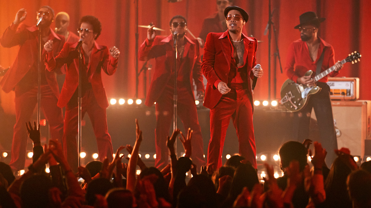 Lorsque le rideau s’est levé, des rayons orange couchant ont inondé la scène. Bruno Mars a tapé sur les bongos. Les touches du piano flottaient alors que les membres énergiques du public se levaient de leurs sièges pour danser. Puis un écran géant est descendu du plafond avec un vaisseau spatial animé pendant que « Silk Sonic Intro » de Bootsy Collins jouait, Mars grattait une guitare sarcelle en criant « Allons-y! » et c’était parti pour les courses.