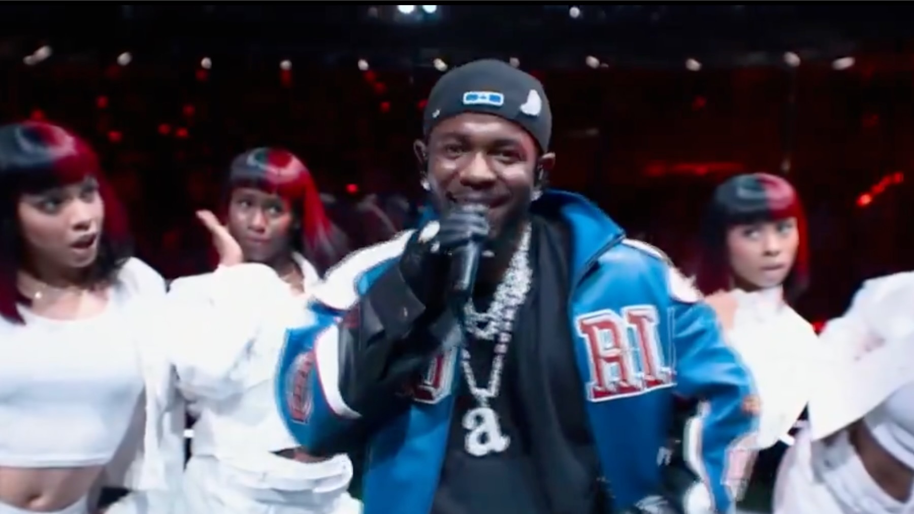 Presque comme un autre spectacle à la mi-temps de la NFL à gros budget récemment, il a définitivement imprégné sa performance avec des nuances fortes d'une esthétique de style Americana tout en pliant ces images en une présentation plus personnalisée et en forme. Les danseurs se sont immédiatement assemblés dans une formation de drapeau américain sur «Humble». Avant de consacrer aux masses bleues et rouge, nous avons vu dans la vidéo «pas comme nous». La façon dont l'équipage des danseurs de fond se blottissait autour d'un réverbère pour «l'homme au jardin» donnait l'impression que Kendrick était en tête d'affiche West Side Story Revival, les pulsations tendues derrière lui évoquant l'énergie nerveuse d'un rassemblement de bataille.