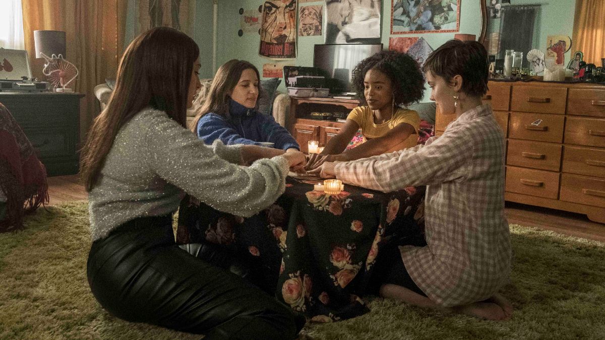 Je t'ai jeté un sort: Un autre amendement inspiré est la belle représentation du film de la sorcellerie. Lister-Jones a consulté Réveiller la sorcière auteur/La vague de sorcière l'hôte Pam Grossman, et sa perspicacité a justifié une représentation stimulante de la magie et de la nature unificatrice du coven lui-même. Lily de Spaeny rejoint Tabby (Lovie Simone), Lourdes (Zoey Luna) et Frankie (Gideon Adlon) dans une communauté solidaire qui ne se penche jamais sur les stéréotypes. Les rituels et les ornements sont authentiques, tout comme le sentiment de jeu qui voudrais accompagner les adolescentes à la découverte de nouveaux pouvoirs. Le seul reproche est l'exécution des effets, à savoir la surutilisation de CGI colorés qui donne à la magie un lavage assez juvénile et finit par diminuer les sorts. Un exemple est la façon dont les filles gèlent le temps, ce qui donne l'impression que quelque chose est sorti d'une sitcom des années 90.