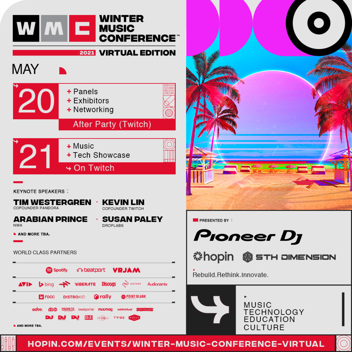 En partenariat avec VRJAM et EDM.com, WMC a lancé un concours pour les artistes afin de garantir une vitrine convoitée à la convention virtuelle, qui se tiendra les 20 et 21 mai. Le « New Music Showcase » sera étoffé en direct au cours des deux jours via la plate-forme de contenu de pointe de VRJAM et la salle de musique immersive VR, 5th Dimension, ainsi que sur Twitch.